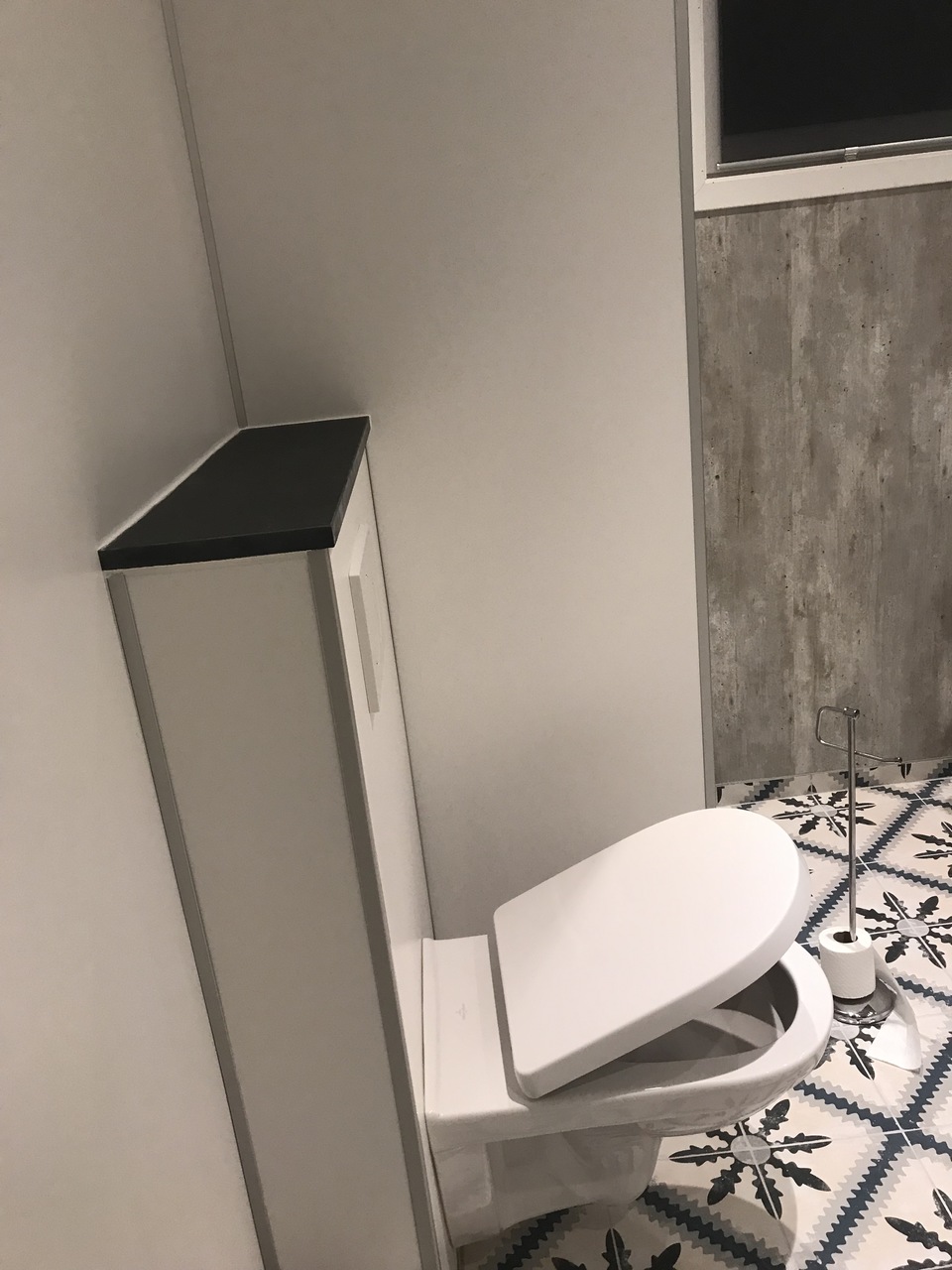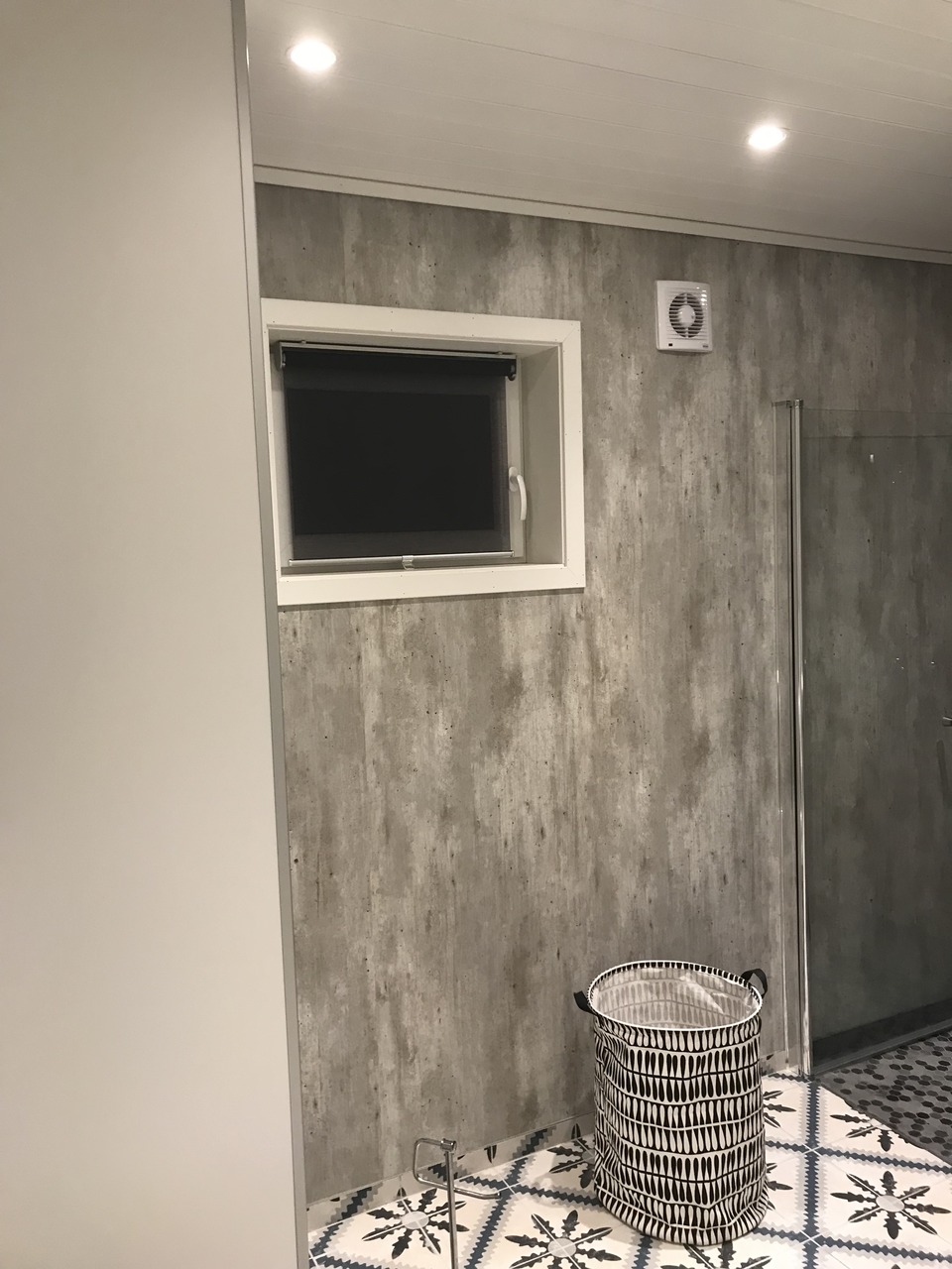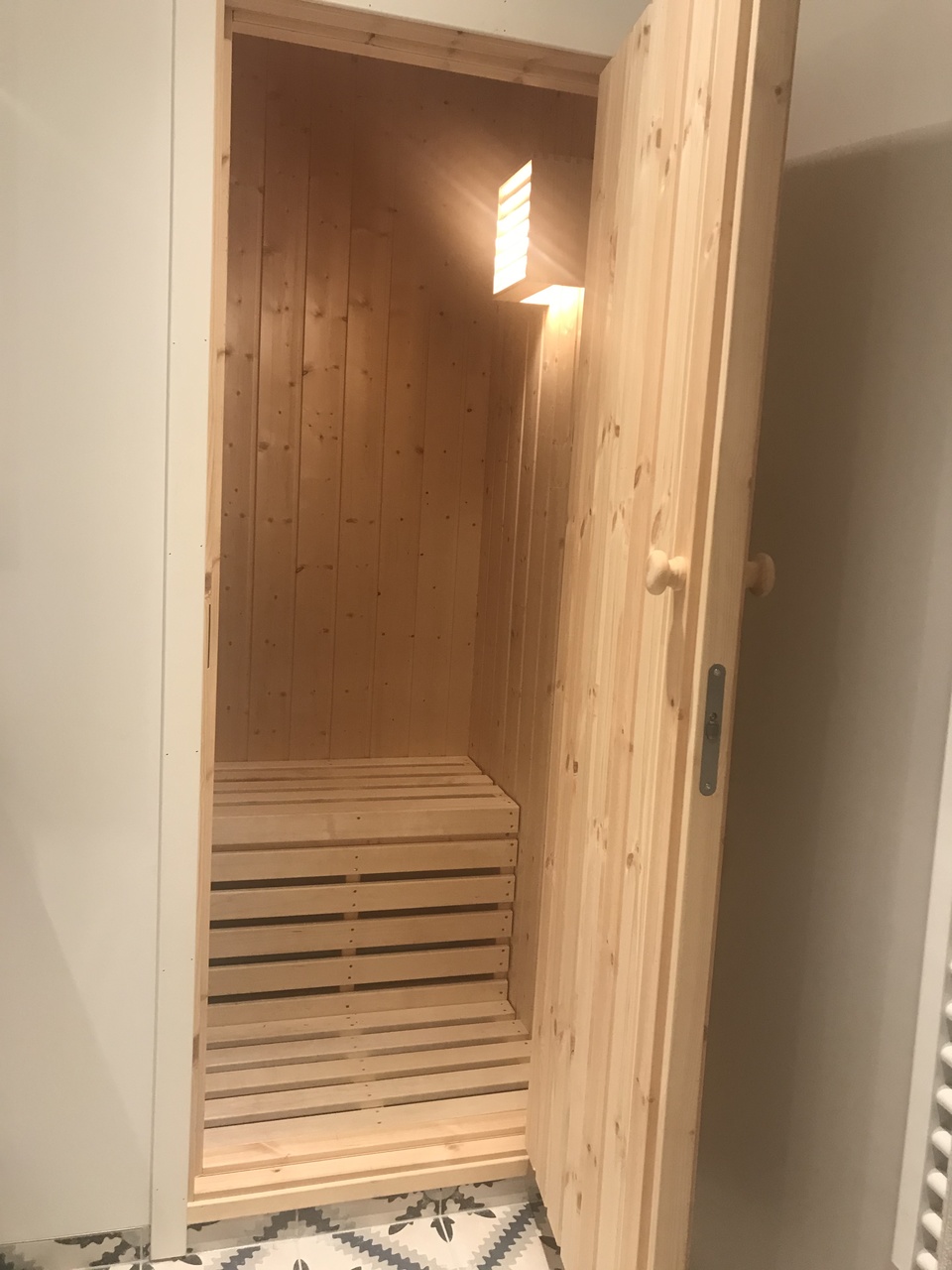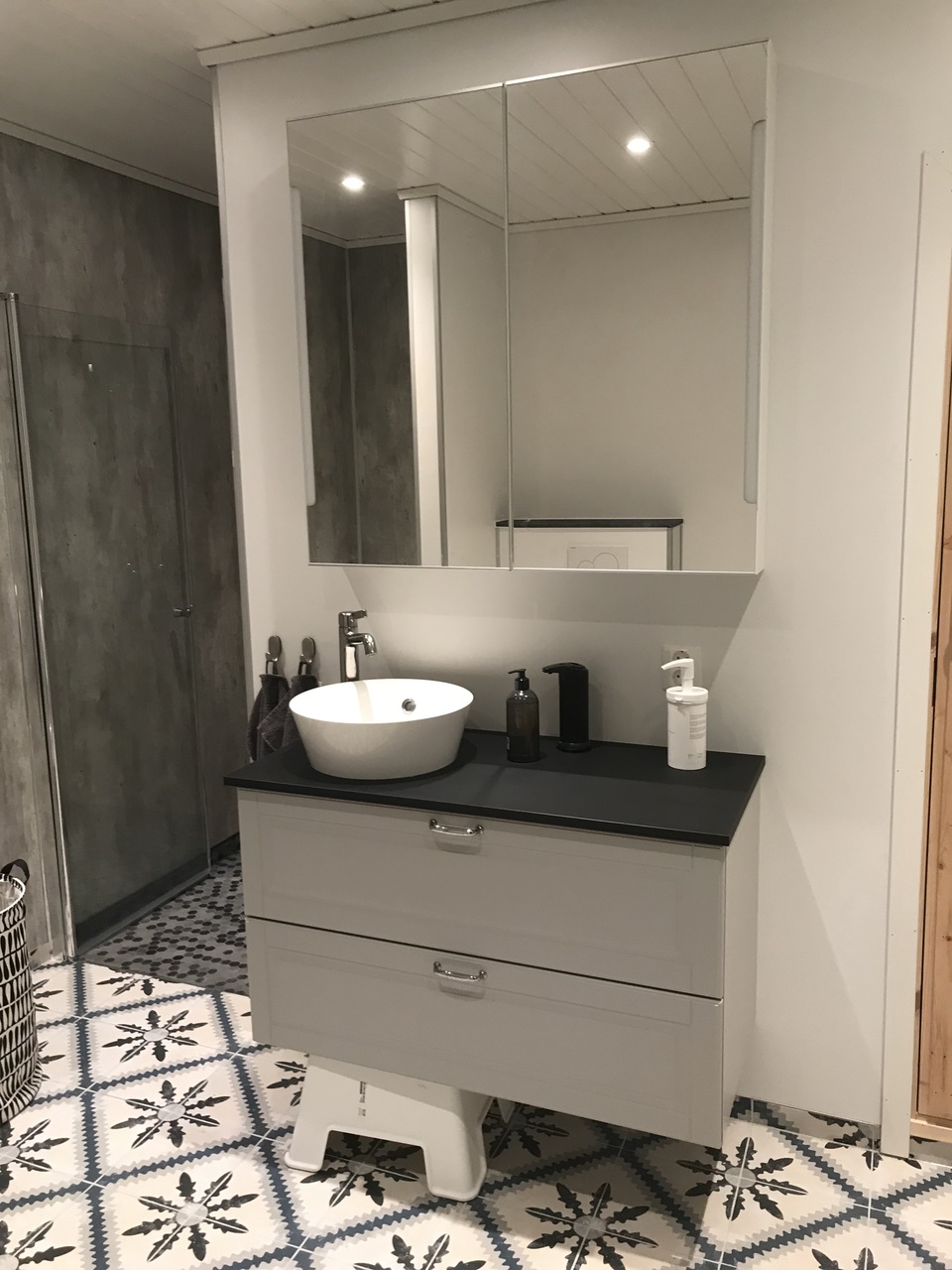 Baderom 1: Stor dusj, bastu, wc, kombinert vaskemaskin og tørketrommel, Stor håndkletørker og baderoms innredning med servant.