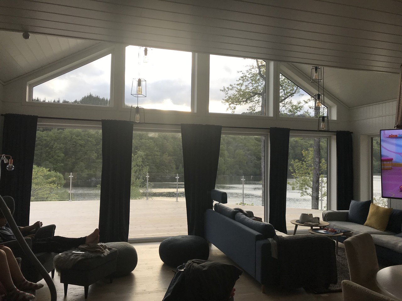 Stue og kjøkken: Tv, fiber/bredbånd, varmepumpe (som også kjøler ned), stort kjøleskap og stort fryseskap, kjøkkenøy med 4 barstoler, skyvedører som fører ut til stor terrasse med en fantastisk utsikt over vannet og badeplassen.