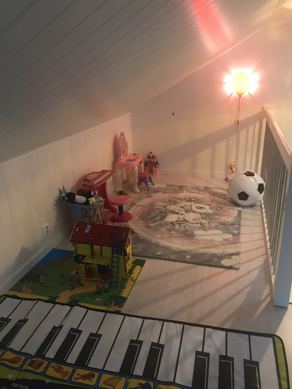 Loft: 2 senger på 120 X 200 (Brukes også som sofa), Tv (Canal Digital), Playstation 3 med spill, lekeområdet for de minste, bord og stoler, lystette gardiner, spill.
