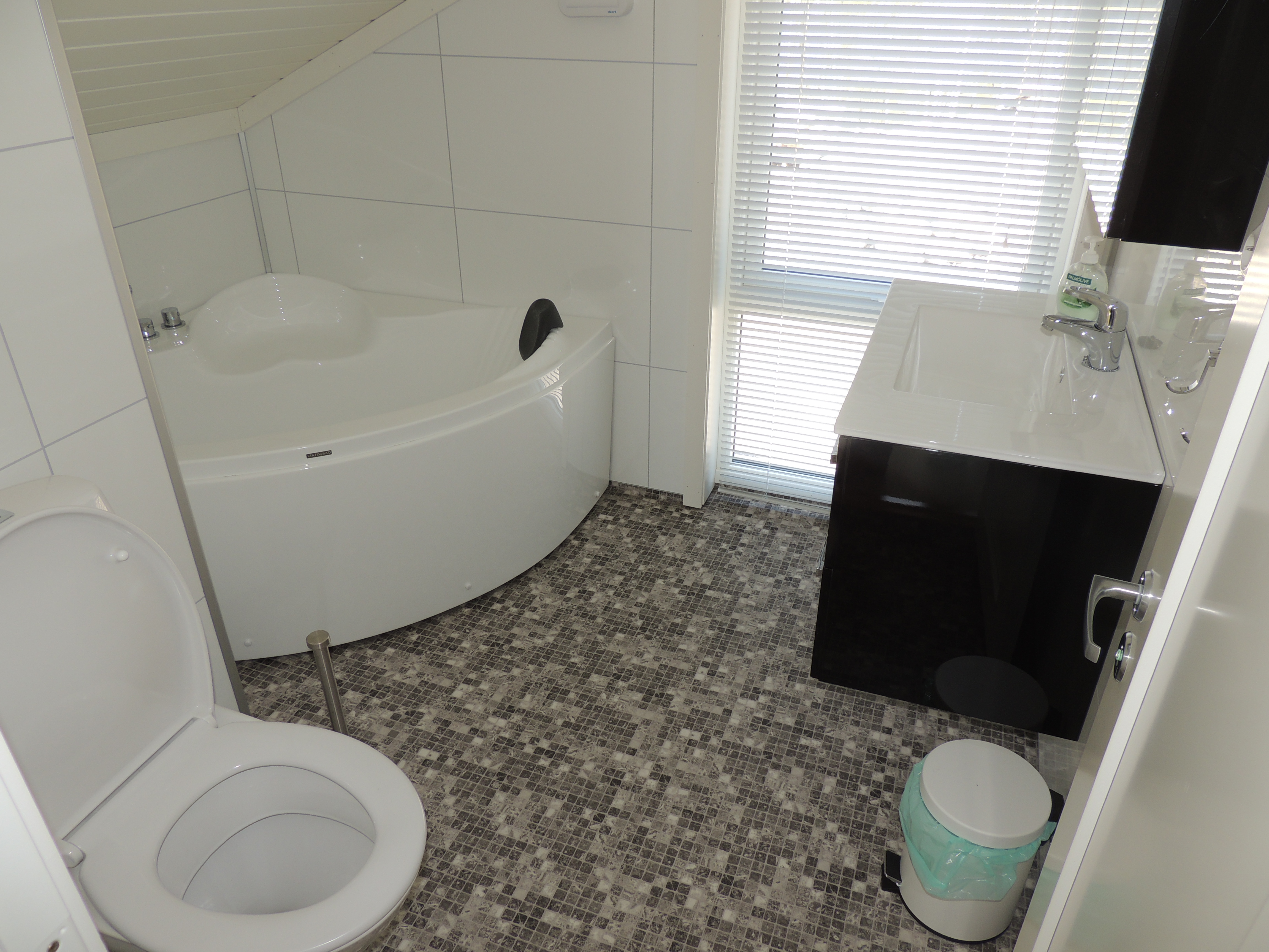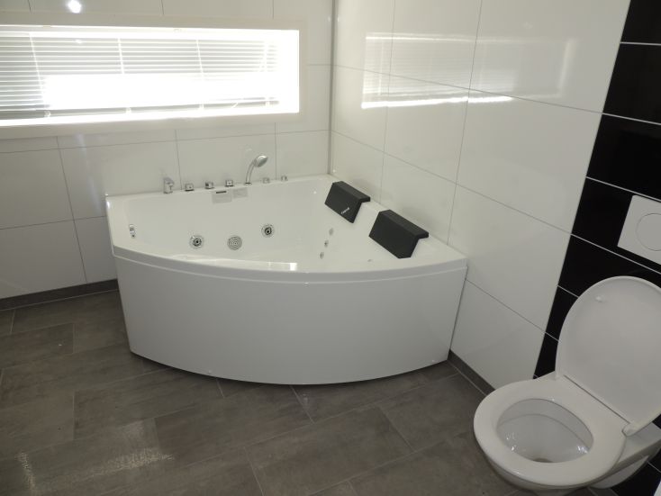 Bad 4,5 m2: Eckbadewanne, WC und Bad-Armaturen.