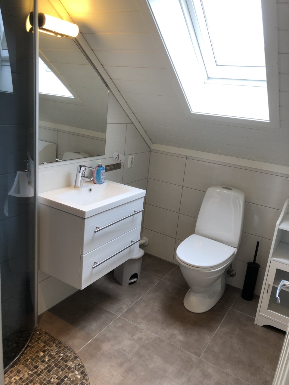 1 tolles Bad mit Dusche, Waschtisch, WC, Dusche.