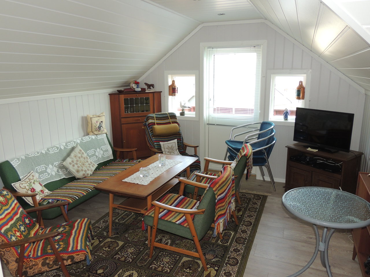 Stue/kjøkken : Fult utstyrt kjøkken, Spisebord, sofa, stoler og Tv.