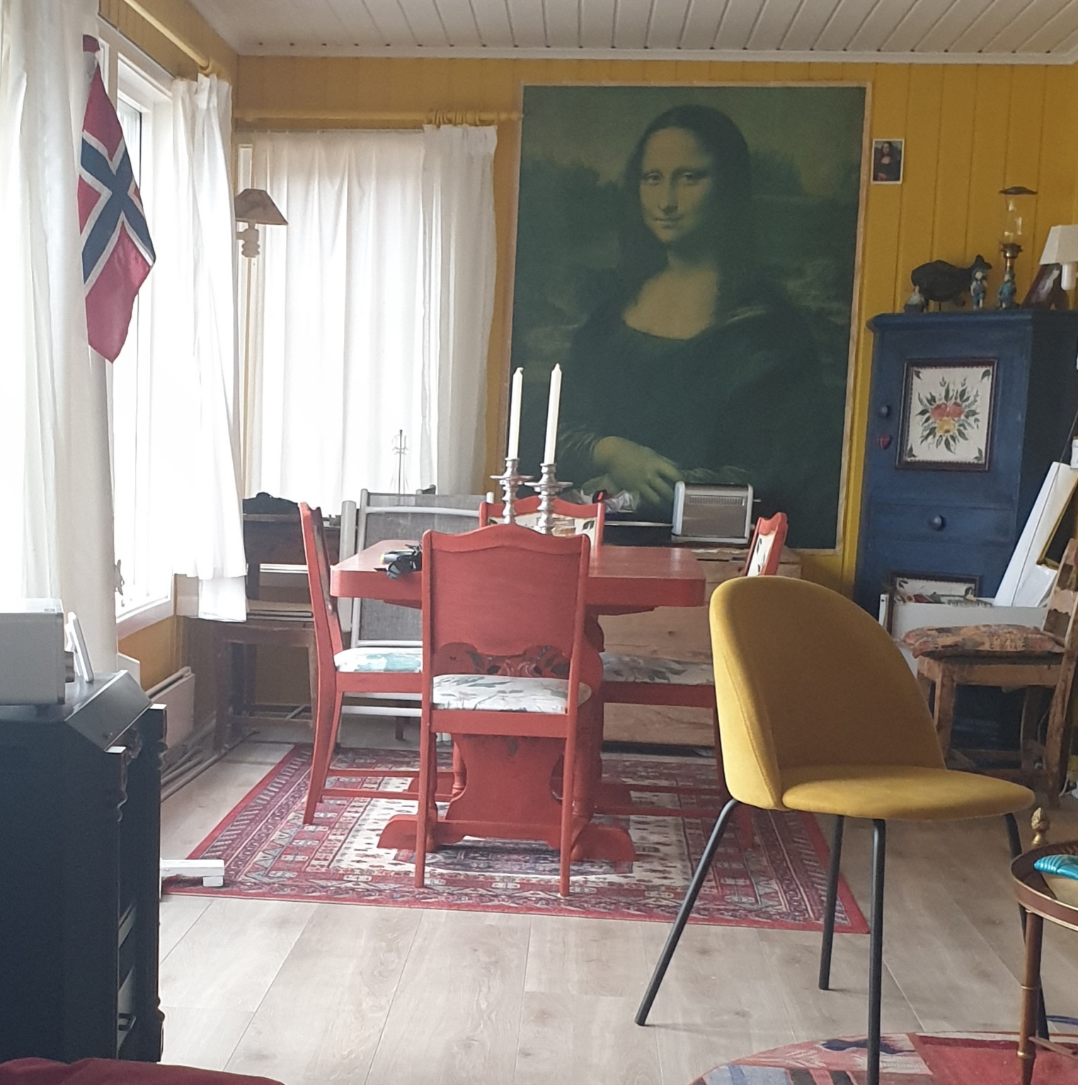 Stue: parabol(norsk-tyske kanaler),elektrisk oppvarming., peis.